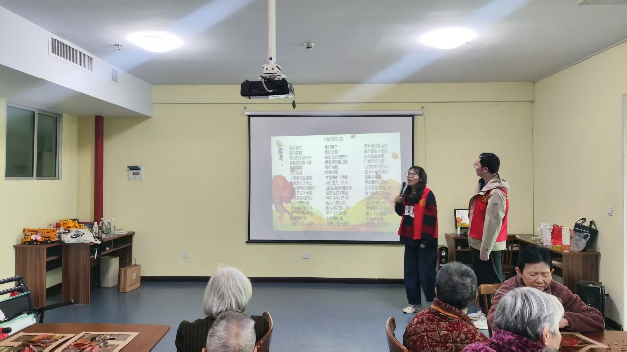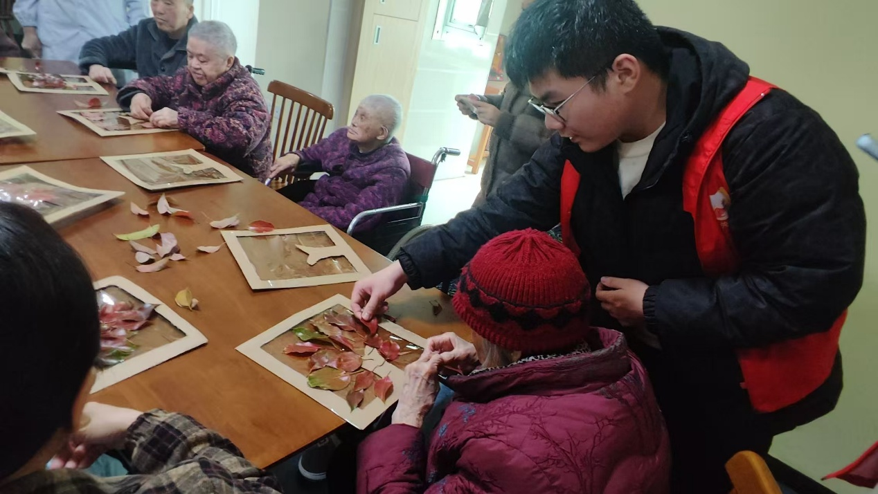 志愿者提前备好材料,陪伴老人开展树叶贴画手工课。老人们巧手拼贴落叶,志愿者在旁耐心协助,用自然落叶拼出温暖画作,在互动中传递关爱,乐享手工时光。随后,志愿者带领老人们开展歌唱活动,一同唱响《刚好遇见你》。志愿者耐心领唱、贴心陪伴,老人们放声高歌,在悠扬旋律中传递温暖,共享欢乐时光。