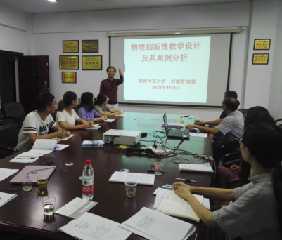 2018年9月9日下午,湖南师范大学刘健智教授应邀在南院6号教学楼二楼6205会议室,给304am永利集团的硕士研究生和导师做了一场题为“物理创新性教学设计及其案例分析”报告。刘教授结合自己多年从事物理学科教学研究生教育的亲身经历和有关的研究成果,介绍了开展“中学物理创新性教学设计”的思路和应该遵循的基本原则。大家一致认为,该报告对指导师生开展中学物理教学设计具有很强的指导意义。接着,刘教授还对学科教学.物理17级7名研究生的论文选题和研究内容,一一给出了详细而有效的指导。