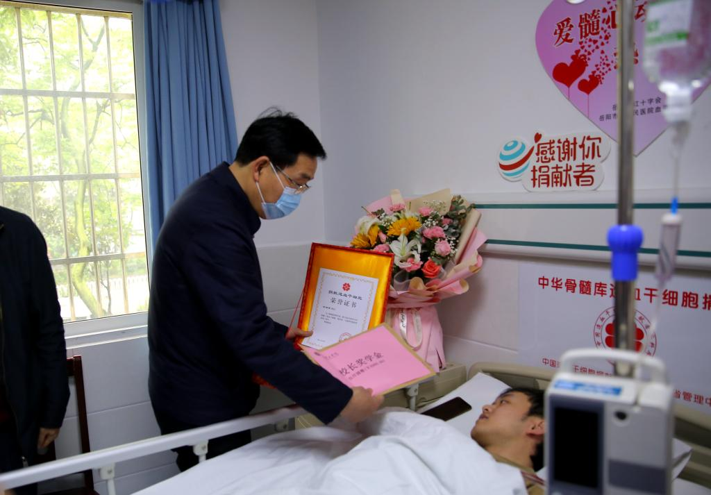 当天,校长宁立伟和304am永利集团、学工部负责人来到岳阳市一医院看望慰问杨旭琪,宁立伟为杨旭琪授予了“捐献造血干细胞”荣誉证书,并颁发了“校长奖学金”。
