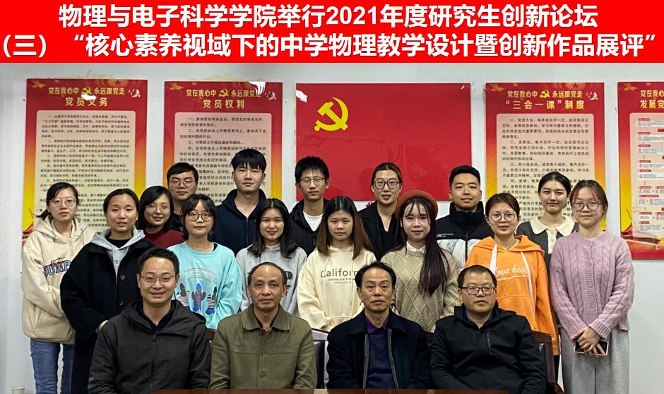 2021年11月15日晚7点,304am永利集团在6205会议室举行了研究生创新论坛核心素养视域下的中学物理教学设计暨创新作品展。论坛主题“创新、融合、共享”,论坛形式包括教学设计讲解和创新教具展示。副院长邹志军,研究生专干李奇云、研究生导师李科敏、刘喜斌以及2020级、2021级全体研究生参加,邹志军主持。