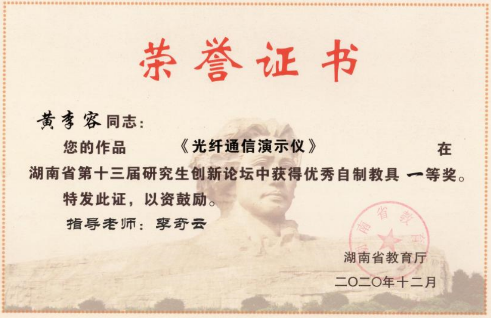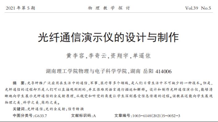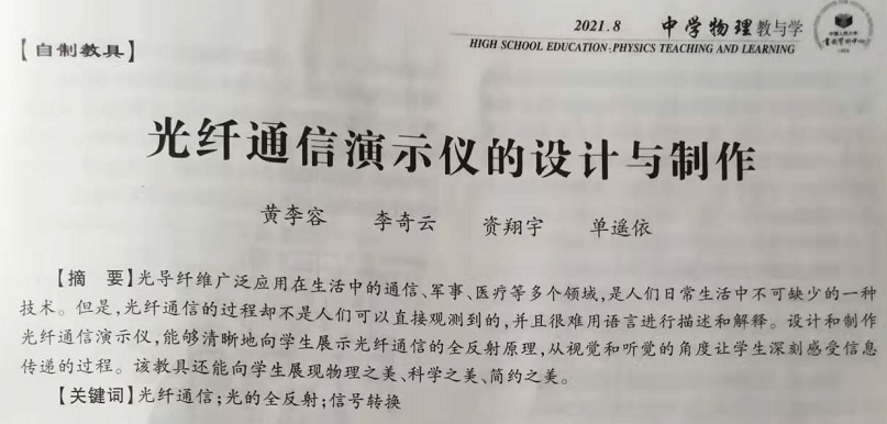 早在2020年6月,黄李容开始对《全反射》进行研究,为突破全反射的可视化,直观演示光导纤维的工作原理,在李奇云老师的指导下,黄李容开始研制“光纤通信演示仪”,期间遇到不少困难,他们查阅文献资料,请教电子信息领域的专家,一次又一次地设计、制作、优化、改进……,克服重重困难,2020年11月终于研制出效果良好的“光纤通信演示仪”。该自制教具在湖南省第十三届研究生创新论坛中荣获优秀自制教具一等奖,以此为基础的论文《光纤通信演示仪的设计与制作》在《物理教学探讨》2021年第5期上发表。