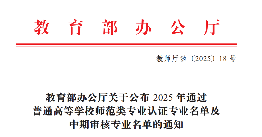 近日,教育部办公厅印发了《关于公布2025年通过普通高等学校师范类专业认证专业名单及中期审核专业名单的通知》(教师厅函〔2025〕18号),我校物理学专业顺利通过普通高等学校师范类专业第二级认证,有效期六年(2025年9月起至2031年8月)。